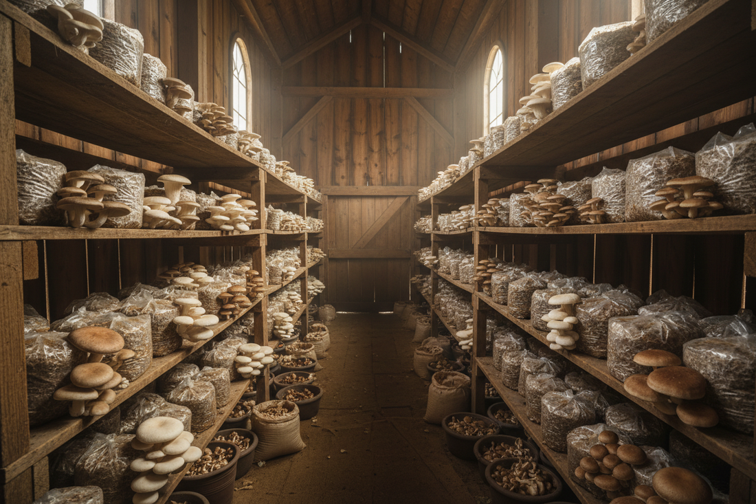 Mushrooms are a completely different world from plants. We grow gourmet varieties like oyster and lion's mane on sterilized substrate in a dedicated fruiting space inside our shed, where we control temperature, humidity, and airflow for each variety. Medicinal and functional mushrooms (reishi, turkey tail) are coming as we expand.